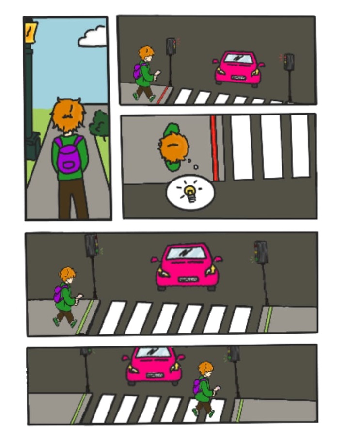 Als technische Lösungen entwickelte die 2AHKT farbige LED-Streifen, welche am Gehwegrand die Ampelfarbe signalisieren und stellt deren Funktion kreativ in einem Comic dar. Während die 3AHKT die Gefahr mangelnder Aufmerksamkeit durch ein Filmskript thematisiert, zeigt der Kurzfilm der 4AHKT die Situation der Fußgängerkreuzung vor dem TGM und stellt die Unfallgefahr anhand einer stop-motion-Animation anschaulich dar.