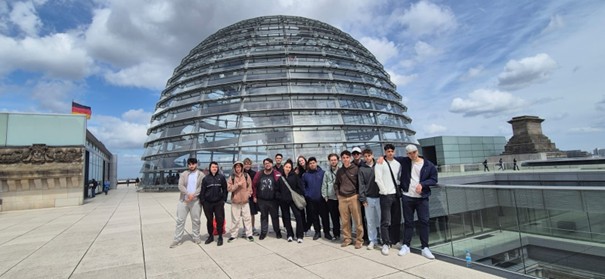 Der letzte Tag begann mit Erklärungen zur Berliner Mauer beim Checkpoint Charly. Der anschließende Rundgang führte zum Denkmal für die ermordeten Juden Europas, weiter zum Brandenburger Tor und anschließend zum Reichstagsgebäude. Die Kuppel des Reichstags ist ein modernes architektonisches Wahrzeichen, entworfen von Sir Norman Foster. Sie besteht aus Glas und Stahl und symbolisiert Transparenz sowie Offenheit der demokratischen Prozesse. Ein zentraler Lichttrichter lenkt Tageslicht in den Plenarsaal und verdeutlicht die Verbindung zwischen Volk und Parlament. Die Schüler:innen der 4BHWII erklommen die spiralförmige Rampe der Kuppel und genossen einen beeindruckenden Panoramablick über Berlin.