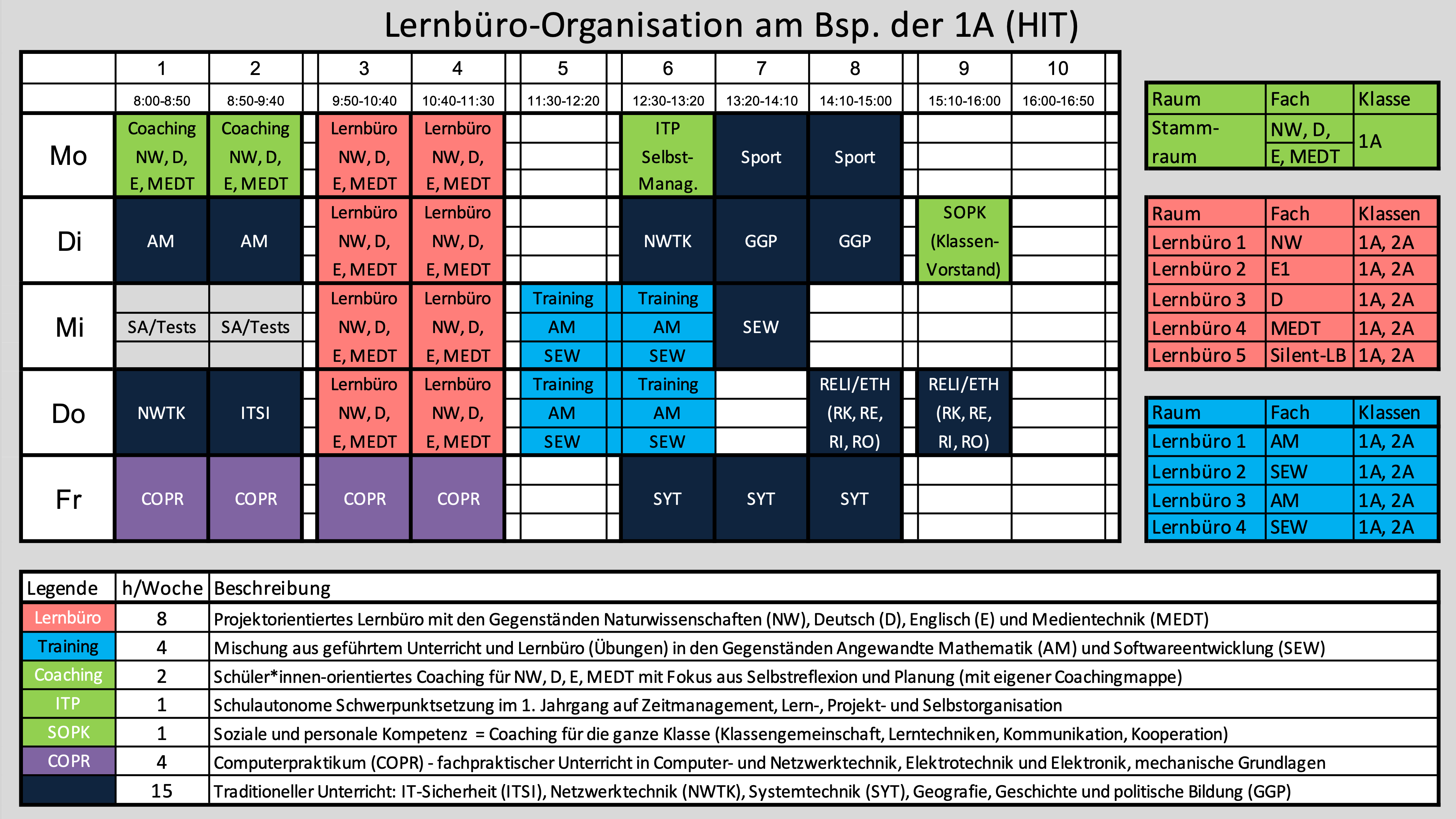 Jeder Gegenstand ist für das Selbststudium (in Gruppen oder Einzelarbeit – ganz nach individuellen Bedürfnissen) vorbereitet. Dazu stehen elektronische Unterlagen auf unserem e-learning-System sowie Unterlagen in Buch- und Papierform zur Verfügung. Zur Orientierung gibt es einen Lernpfad, der eine ungefähre zeitliche bzw. organisatorische Richtung vorgibt. Die Unterrichtsinhalte sind dabei kompetenzorientiert vorbereitet, d.h. alle Inhalte sind als grundlegende Inhalte oder erweiterte Inhalte gekennzeichnet. Grundlegende Inhalte sind all jene Inhalte, die jede Schülerin und jeder Schüler erlernen muss, um die Ausbildungsziele der höheren Abteilung für Informationstechnologie abzudecken und die in der Benotung das Genügend/Befriedigend abdecken. Erweiterte Inhalte sind jene Inhalte, die nach persönlichem Interesse über das grundlegende Wissen hinaus erarbeitet werden können und die in der Benotung das Gut/Sehr gut abdecken. Damit ist es möglich, dass sich gute SchülerInnen nach ihren Interessen vertiefen können und sich andere Schüler*innen gleichzeitig mehr Zeit für die grundlegenden Inhalte nehmen können um somit in aller Ruhe eventuelle Schwächen in Stärken umwandeln können.