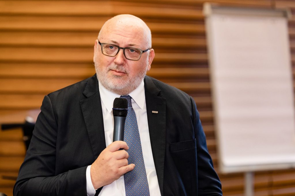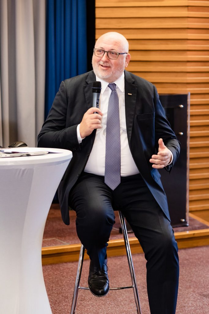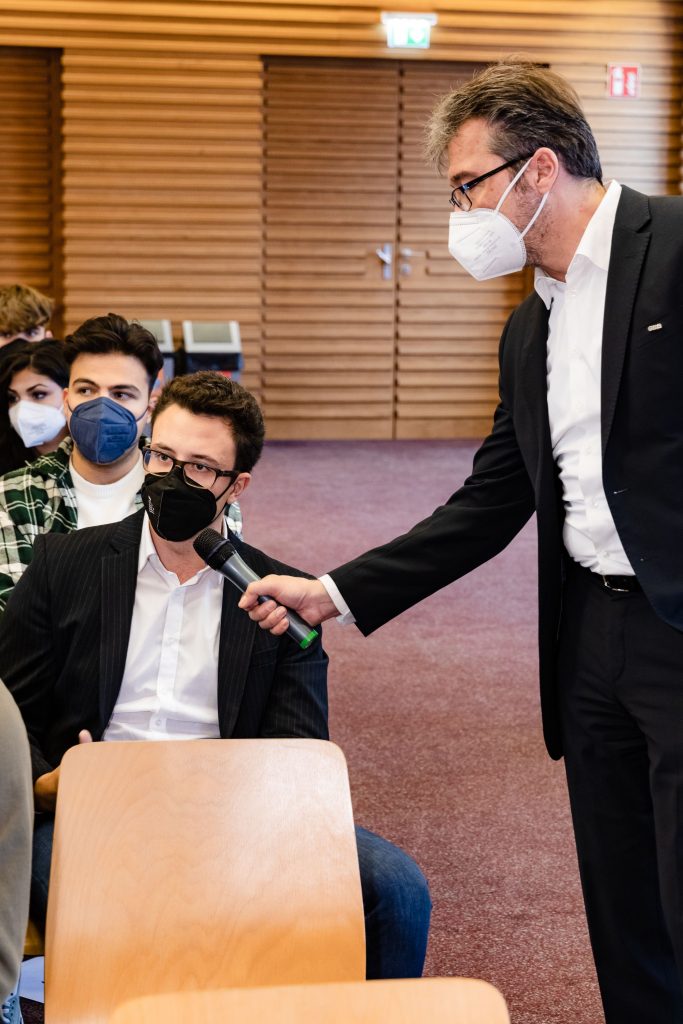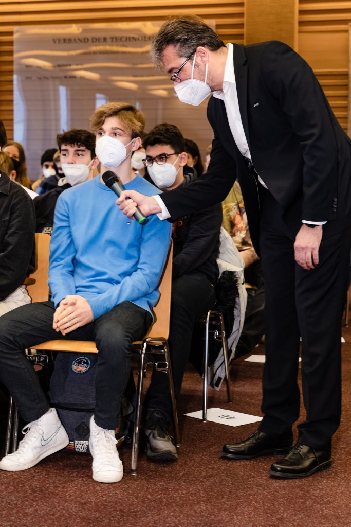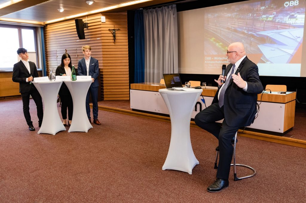CEO Andreas Matthä zeigte zu Beginn in einer kurzen Präsentation den jungen Techniker*innen die wesentlichen ÖBB Entwicklungen und Zukunftspläne im Personenverkehr, Infrastruktur und Schienengüterverkehr auf, „Bereits jetzt fahren in keinem anderen Land der EU mehr Menschen pro Jahr mit der Bahn, wie in Österreich. Auch beim Güterverkehr sind wir als Nummer 2 in Europa ganz vorne mit dabei.“ betonte Matthä. Im Vor-Coronajahr 2019 nutzen 477 Millionen Reisende die Angebote der ÖBB mit Bahn und Bus bzw. beförderte die ÖBB Rail Cargo Group über 100 Mio. Tonnen/Jahr. Ein wichtiger Punkt in der Diskussion war auch der Klimawandel und die Rolle der Bahn – „Die Bahn ist die Antwort auf die Klimakrise“. Die ÖBB sparen jährlich rund 4,2 Mo. Tonnen CO2 ein. Zur Erreichung der Klimaziele der EU bis 2050 bzw. Österreichs bis 2040 müssen vor allem mehr Güter mit der Bahn transportiert werden. „Wir brauchen eine Verkehrswende. Weniger Straßen- dafür mehr Schienengütertransporte! Schließlich ist die Bahn gegenüber dem Lkw wesentlich nachhaltiger.“ unterstrich Matthä. Damit die Verkehrswende gelingt, investieren die ÖBB in die Infrastruktur so viel wie noch nie und werden bis 2040 die Leistungsfähigkeit auf der Schiene in Österreich verdoppeln. Allein das in der Geschichte Österreich größte Investitionsprogramm von 18,2 Mrd. Euro von 2022 bis 2027 unterstreicht die rot-weiß-roten-Ambitionen; kein Land in der EU investiert derzeit mehr pro Kopf in die Bahn!