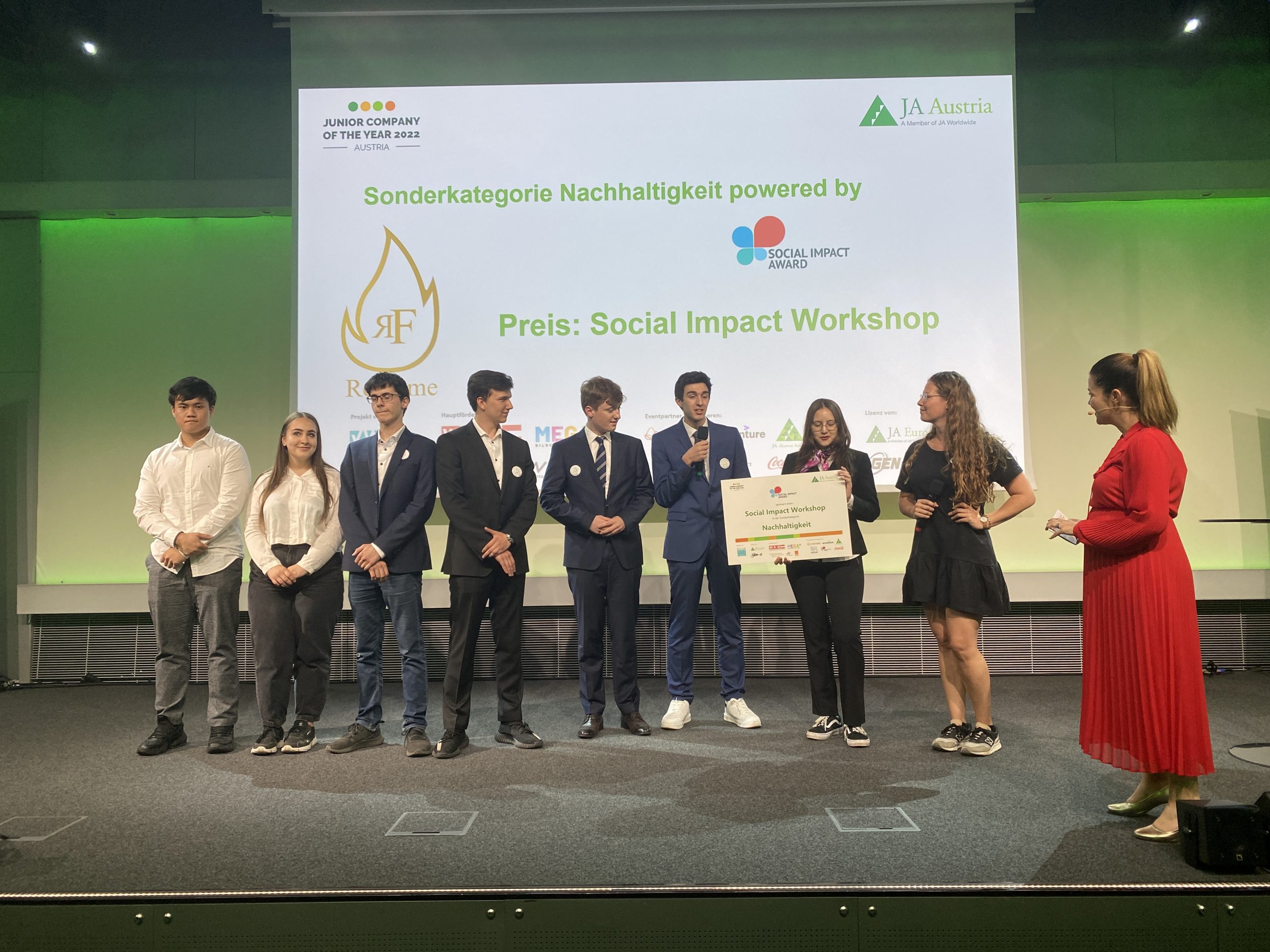 Ein erfolgreiches Juniorjahr geht zu Ende. Beyond gewinnt den Businessplanwettbewerb, alle vier Junior Companies unserer Abteilung sind im Finale des Wiener Landeswettbewerbs, bei dem ReFlame als beste Junior Company Wiens ausgezeichnet wird. Und nun gewinnt ReFlame im Bundesfinale der besten Junior Companies Österreichs den Social Impact Award als nachhaltigste Junior Company – wir gratulieren!